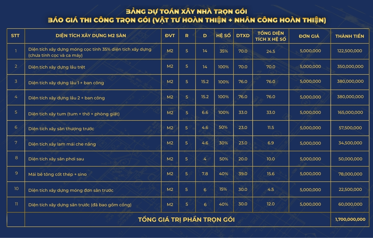 BẢNG DỰ TOÁN XÂY NHÀ TRỌN GÓI – BÁO GIÁ THI CÔNG TRỌN GÓI (VẬT TƯ THÔ + NHÂN CÔNG HOÀN THIỆN)