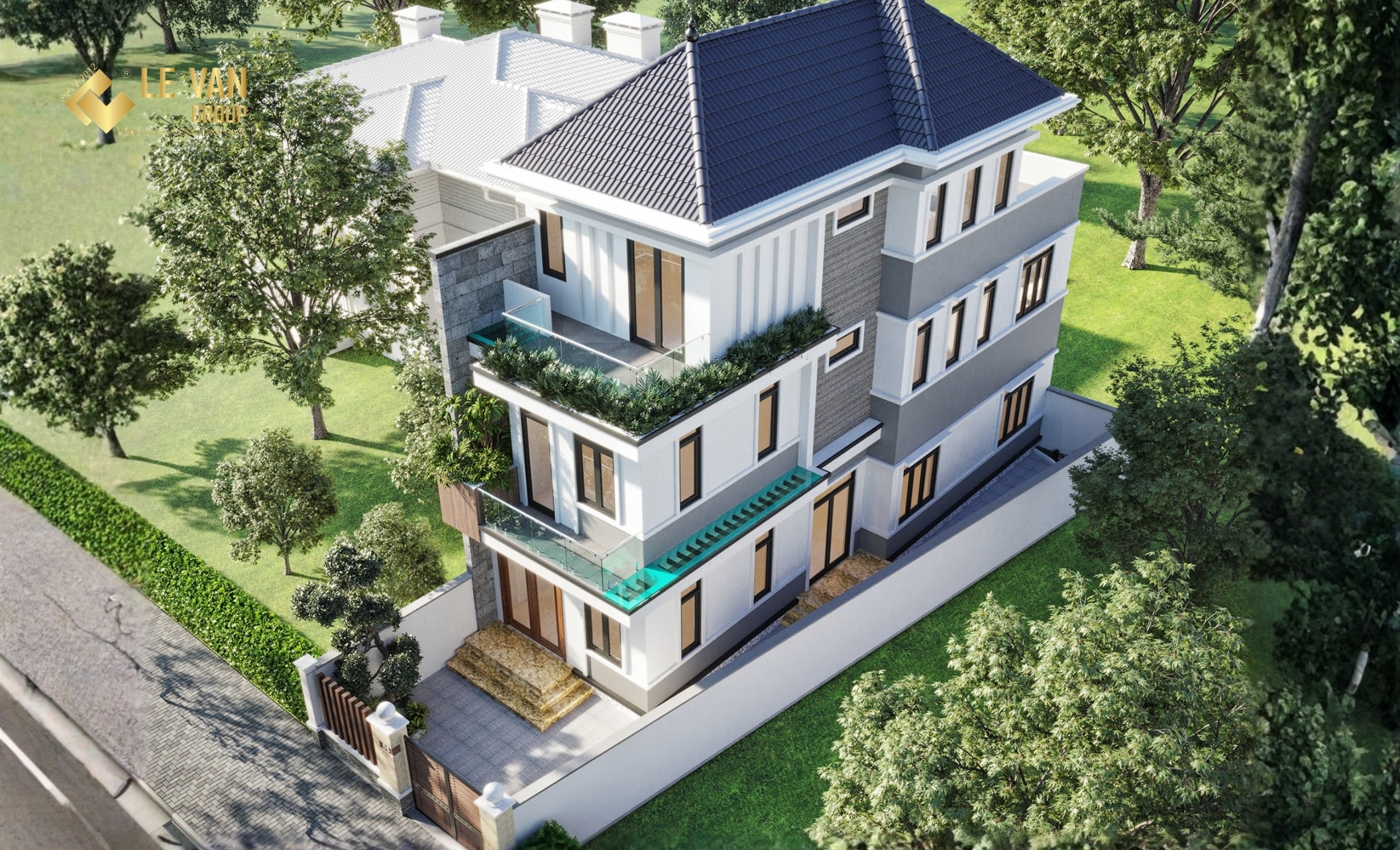 • Mái Thái/Mái dốc: Việc sử dụng mái dốc (mái Thái hoặc tương tự) không chỉ tăng tính thẩm mỹ mà còn giúp chống nóng, thoát nước hiệu quả, rất phù hợp với khí hậu Việt Nam.